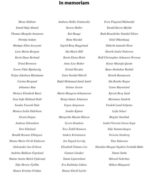 For 14 år siden ble Norge rammet av terror. 14 år siden Anders Behring Breivik drepte 77 mennesker og skadet 42. 14 år siden en varm sommerdag ble forvandlet til et mareritt. 14 år siden en helt vanlig arbeidsdag i demokratiets tjeneste ble forvandlet til et inferno av blod, døde kropper, ruiner – da terroristen var ferdig i med å ødelegge regjeringsbygningen etterlot han seg 8 drepte og 9 skadete. 14 år siden en fredelig sommerleir på idylliske Utøya ble til et mareritt. 14 år siden 69 unge liv så brutalt ble stoppet før de hadde fått begynne å virke – 33 ble skadet, mange av dem må leve resten av livet med skadene. Over hele landet holdes det ulike minnemarkeringer. Vi i Extraavisen vil markere dagen med å trykke listen over de drepte, og minnes de døde med ærefrykt og respekt.