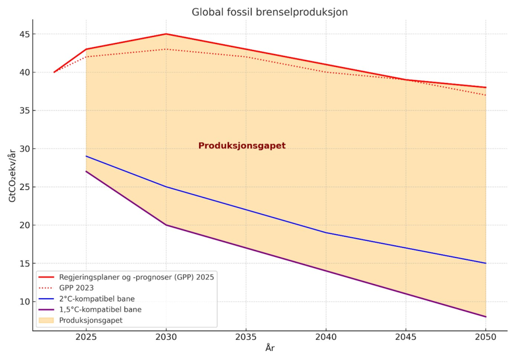 En rapport lansert mandag denne uka av Stockholm Environment Institute – Production Gap Report 2025, viser at verdens regjeringer planlegger å produsere 120 % mer fossilt drivstoff i 2030 enn det som er forenlig med å begrense global oppvarming til 1,5 °C. For 2 °C er gapet på 77 prosent. Prognosene for utvinning og produksjon av kull, olje og gass er alle økende sammenlignet med forrige vurdering i 2023. Mange scenarier viser også økende oljeproduksjon etter 2050. Følgen er at også begrensningen i den globale temperaturen til to grader, som er smertegrensen i Parisavtalen, nå er utenfor rekkevidde – uten svært dramatiske og raske tiltak.