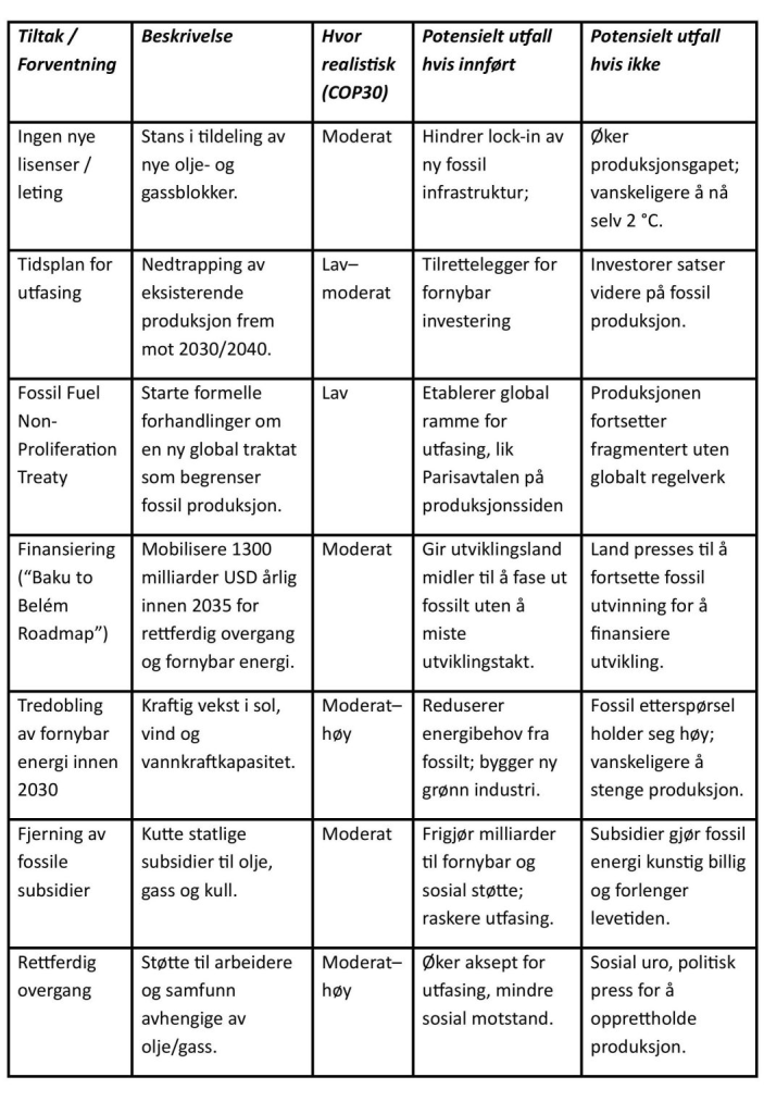 En AI-gjennomgang av forventningene til FNs klimatoppmøte i Belém i tabellen nedenfor gir et nøkternt bilde av mulige tiltak/forventninger som vil bli diskutert, sannsynligheten for positive beslutninger, hva de mulig kan føre til, og konsekvensene av at møtet ikke klarer å gjøre tilstrekkelige vedtak. Se mer om COP30 som startskudd for oljestopp i denne artikkelen på BKAs hjemmeside.