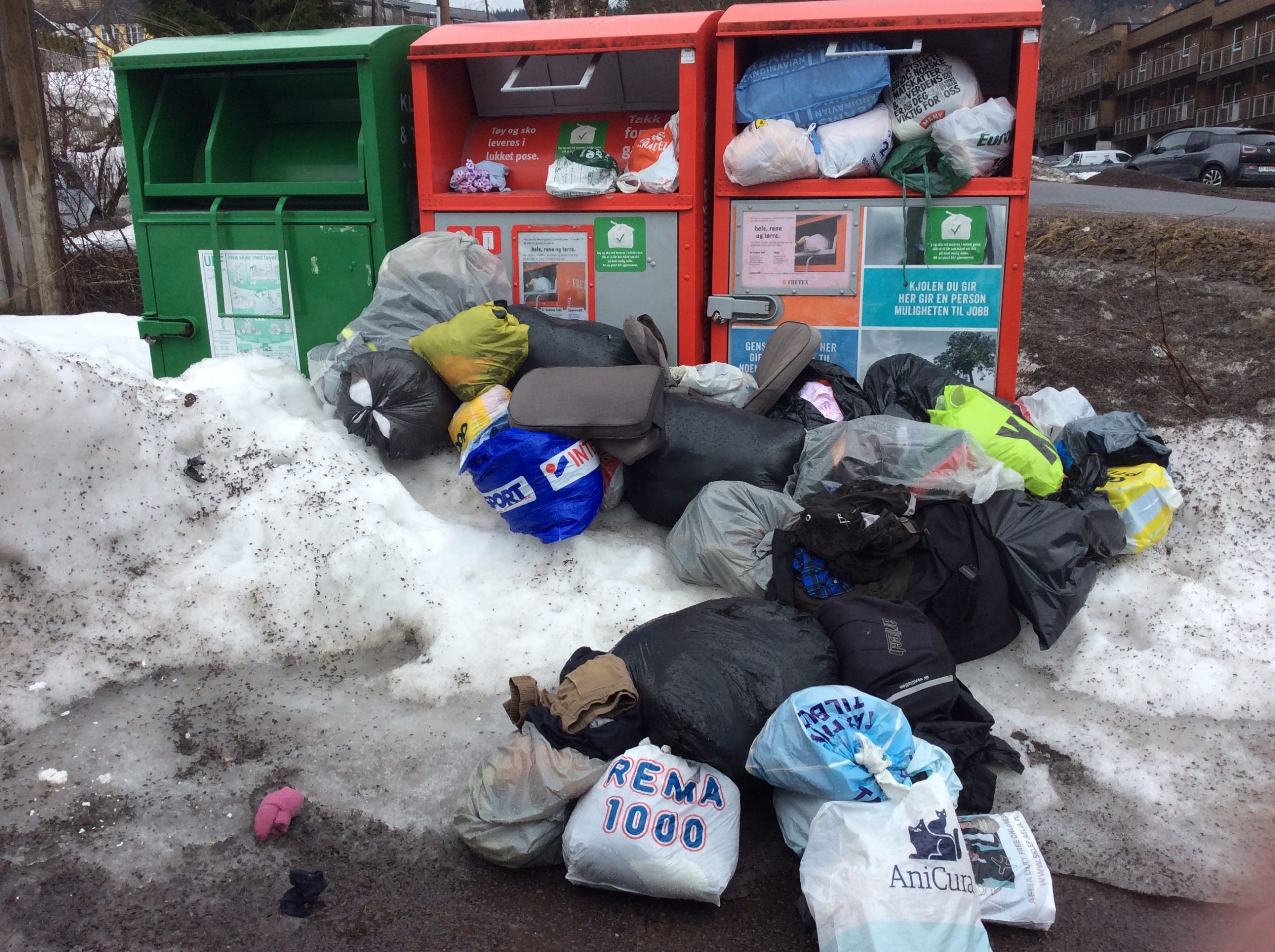 Flere av våre lesere har tipset seg om om at disse boksene i lengre tid har vært fulle, og at folk har slengt fra seg poser fulle av klær på bakken rundt boksene – tydeligvis fordi de ikke har kunnet bruke boksene.