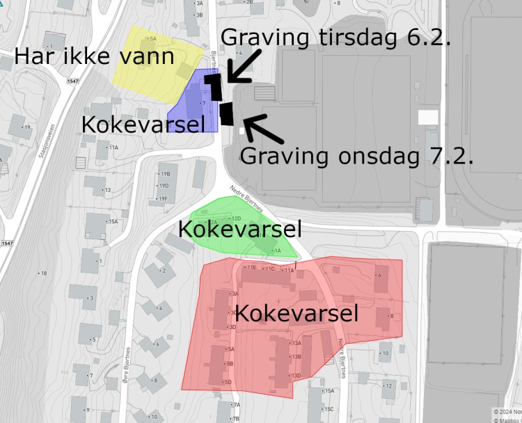 Bjertnesveien 7 vil miste vannet når arbeidene pågår onsdag 7.2. Det sendes ut melding når vannet blir borte og når vannet kommer tilbake. Når vannet kommer tilbake, blir det sendt kokevarsel på SMS.