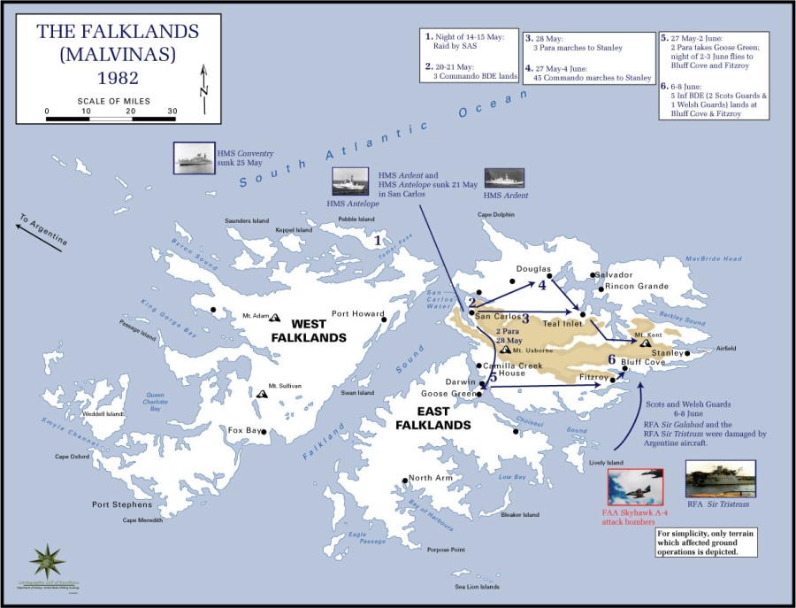 2. april 1982 invaderte og okkuperte argentinske tropper Falklandsøyene og dagen etter Sør-Georgia og Sør-Sandwichøyene i et forsøk på å overta suvereniteten de lenge hadde hevdet over øyene. Den 5. april sendte den britiske regjeringen en marinestyrke for å bekjempe den argentinske invasjonsstyrken. Konflikten pågikk i 74 dager og endte med at Argentina overga seg 14. juni 1982, og britene gjenvant kontrollen over øyene. Total omkom 649 argentinere, 255 briter og tre sivile falklendere i løpet av kamphandlingene.