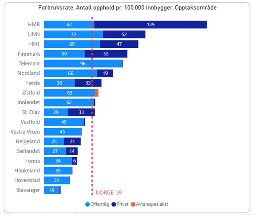 I forbindelse med at avtalene som Helse Midt-Norge RHF inngår med kommersielle tilbydere for kirurgiske og medisinske helsetjenester skal fornyes, ble det besluttet å legge oppdaterte behovsanalyser til grunn for anskaffelsen. Dataene som er lagt til grunn (jan. 2022-des. 2023) er nasjonal aktivitets- og ventelistetall fra Norsk pasientregister utlevert av Folkehelseinstituttet.Den røde stiplede linjen i bildet viser landsgjennomsnittet av aktiviteten for skulderkirurgi per 100 000 innbyggere fordelt etter hvilket bostedsområde pasienten tilhører. Det er usannsynlig at forekomsten av skuldersmerter som krever kirurgisk behandling er ujevnt fordelt utover landet, så variasjonen viser et bilde av det som kalles uønsket variasjon – altså forskjeller som ikke kan forklares med tilfeldige svingninger eller ulikheter i sykelighet og pasientpreferanser.