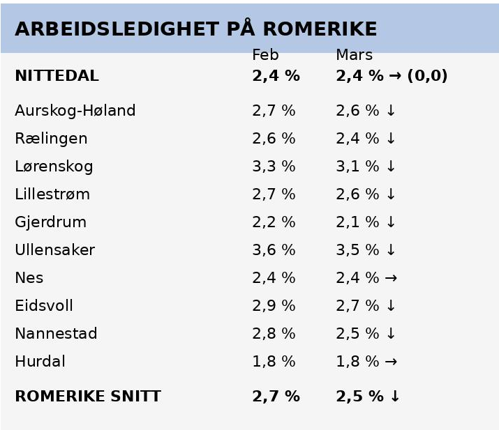 Med 2,4 prosent ledighet ligger Nittedal fortsatt på et moderat nivå, og under det regionale snittet. Til sammenligning har gjennomsnittet på Romerike falt fra 2,7 til 2,5 prosent i samme periode.
