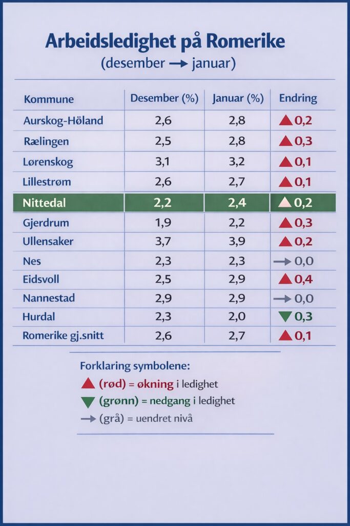 Selv om ledigheten i Nittedal har økt noe etter nyttår, framstår arbeidsmarkedet fortsatt som relativt stabilt sammenlignet med mange andre kommuner på Romerike. Utviklingen kan delvis forklares med sesongvariasjoner, og kommunen holder seg på et moderat nivå også inn i 2026.