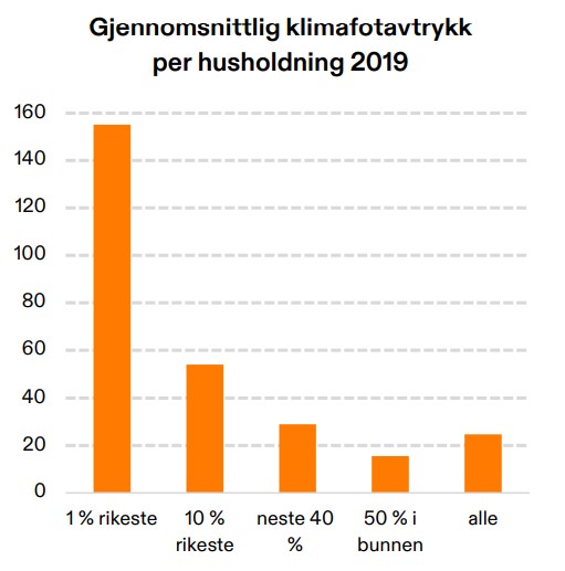 Tallene i den norske rapporten er sammenliknbare, med den forskjell at «våre fattige» er i en helt annen situasjon enn flertallet av verdens fattige. Klimafotavtrykket for de 1 prosent rikeste husholdningene i Norge var på 155 tonn CO2– ekvivalenter i 2019. Gjennomsnittet blant de 10 prosent rikeste var på 54 tonn, mens de 50 prosentene med lavest inntekt og formue kun slapp ut ca. 15 tonn i gjennomsnitt.